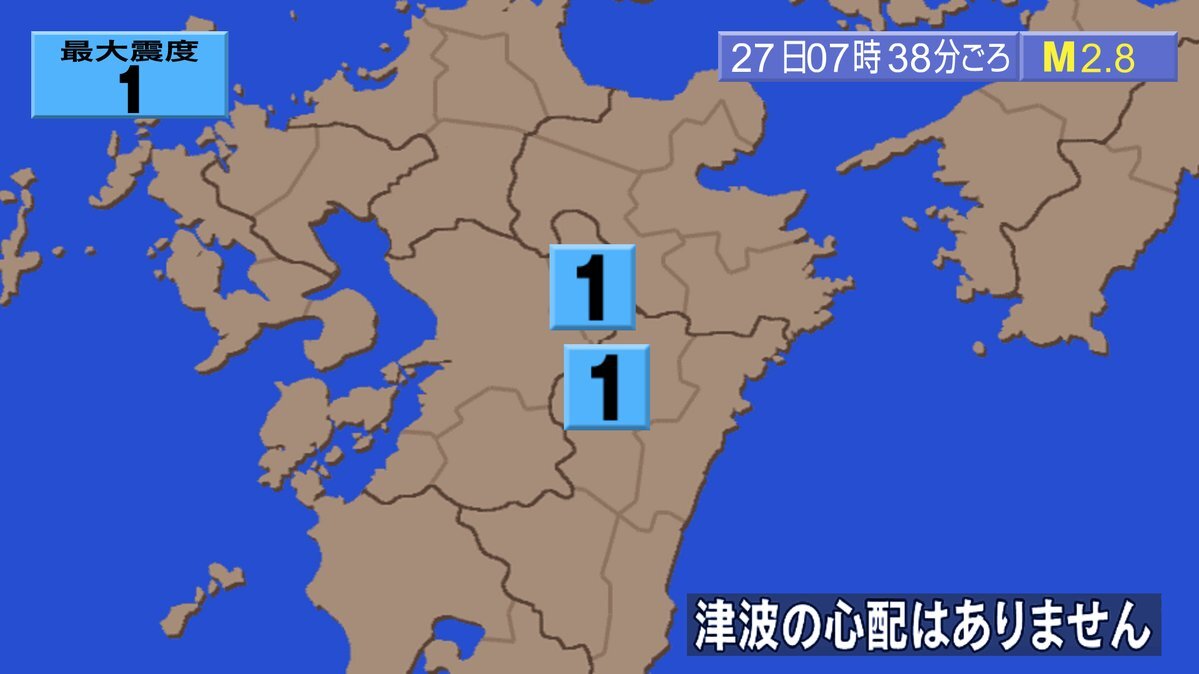 【地震情報】 発生時刻:2025年11月27日07時38分 震源地:熊本県阿蘇地方 マグニチュード:2.8 最大震度:1 震源の深さ10km この地震による津波の心配はありません。 #地震 #地震情報 pic.x.com/DbNmpbeb3i