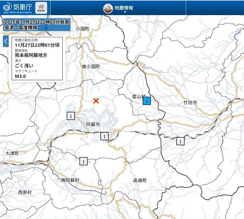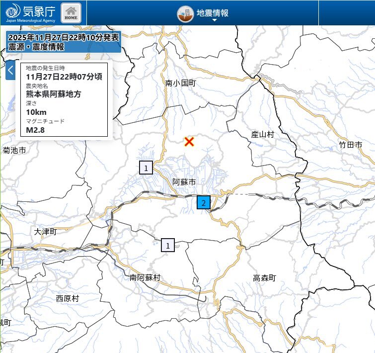 【地震情報】 発生時刻:2025年11月27日22時07分 震源地:熊本県阿蘇地方 マグニチュード:2.8 最大震度:2 震源の深さ10km この地震による津波の心配はありません。 #地震 #地震情報 pic.x.com/BJ5aTTP9q5