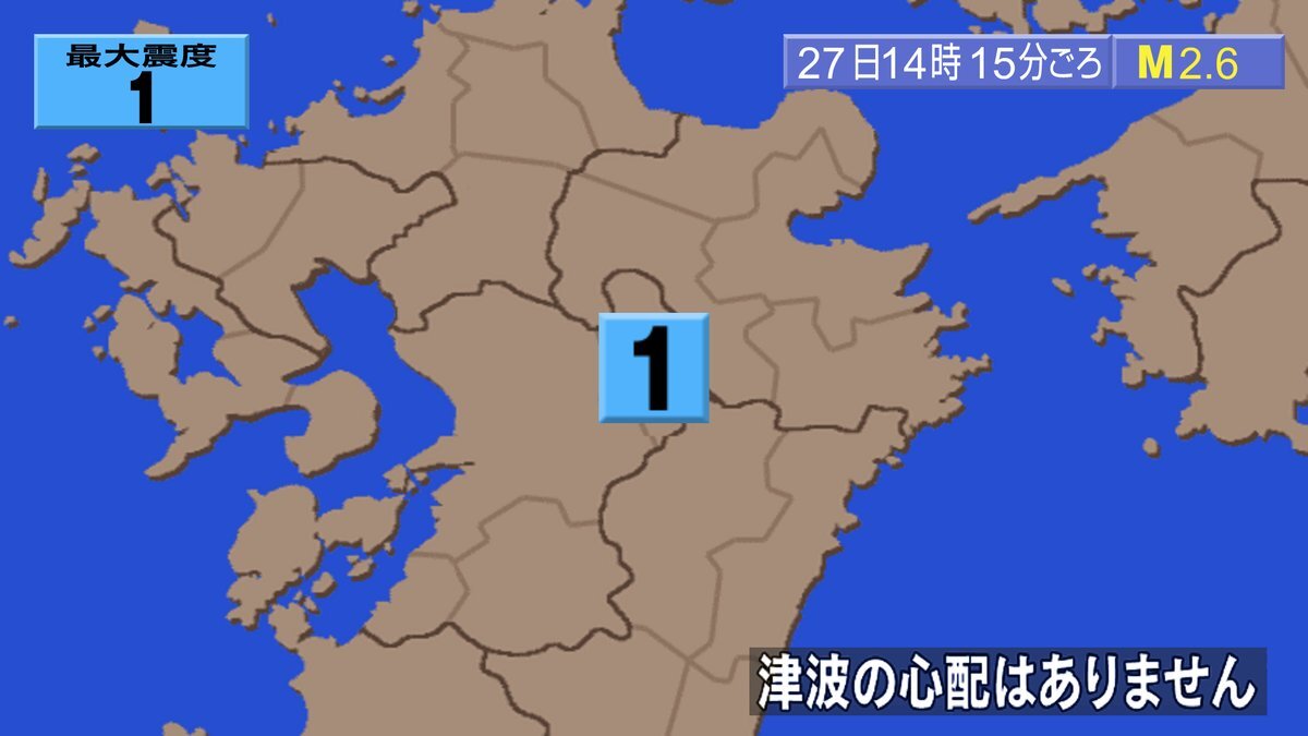 【地震情報】 発生時刻:2025年11月27日14時15分 震源地:熊本県阿蘇地方 マグニチュード:2.6 最大震度:1 震源の深さ10km この地震による津波の心配はありません。 #地震 #地震情報 pic.x.com/Dek89AoCKZ