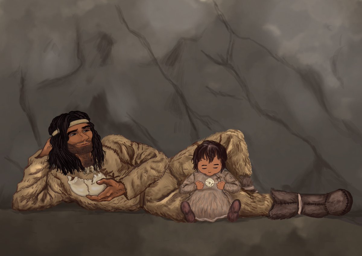 レイヤーがズレてたので再投稿 父と子とアニメと頭蓋盃 一万数千年前 フランスあたりのマドレーヌ文化人たち #歴史創作 #旧石器時代 pic.x.com/NDBFxzUfJU x.com/kotouta_sige1/…