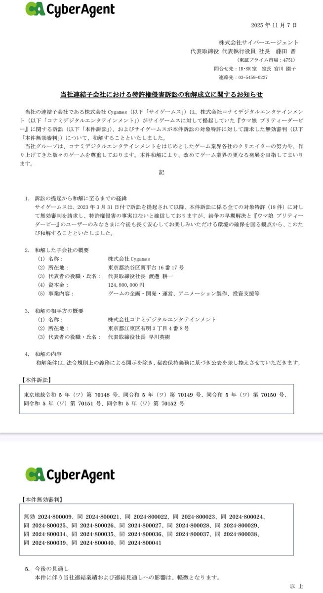 朗報! サイバーエージェント[4751]:当社連結子会社における特許権侵害訴訟の和解成立に関するお知らせ 2025年11月7日(適時開示) :日経会社情報DIGITAL:日本経済新聞 nikkei.com/nkd/disclosure… #日経会社情報