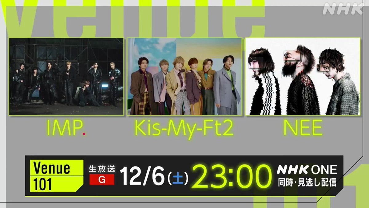 📢#Venue101 次回は12/6(土)23:00~ 生放送📡 出演アーティストは… 💋#IMP./KISS 👍#KisMyFt2/&Joy 🥁#NEE/マニック 🎙MC #生田絵梨花 #濱家隆一 スマホでも👇 nhk.jp/p/venue101/ts/… #KISS_IMP. #KisMyFt2_andJoy pic.x.com/J3WS7gB1na