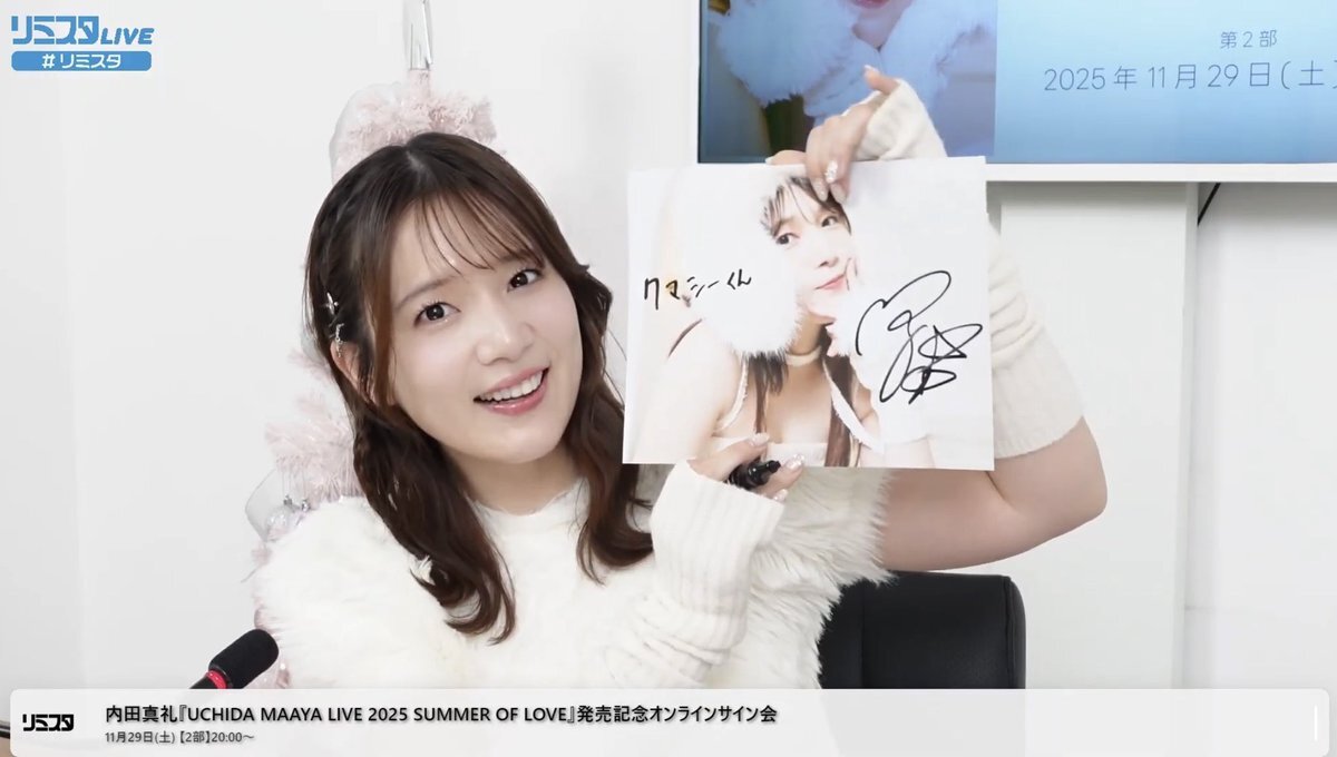 本日は 「UCHIDA MAAYA LIVE 2025 SUMMER OF LOVE」Blu-ray発売記念オンラインサイン会✒️ サイン会の様子はYouTubeでどなたでもご覧いただけますのでお見逃しなく✅ 🔽第1部18時~ youtube.com/live/vGSrIL7A7… 🔽第2部20時~ youtube.com/live/ZB6Ry_SmA… #内田真礼 #リミスタ x.com/MaayaUchida/st…