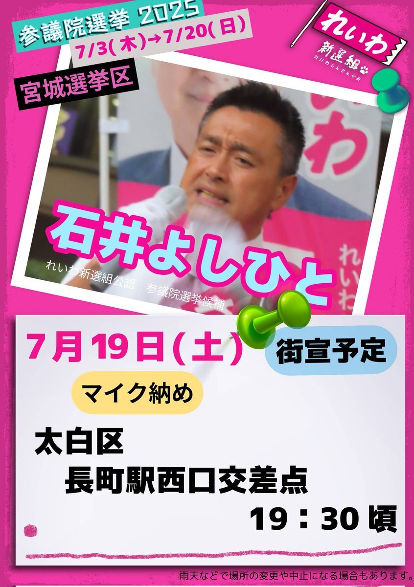 宮城県の皆さん、本日がラスト、マイク納めとなります。 #宮城選挙区 #石井よしひと #れいわ新選組 #消費税は廃止 #参議院選挙2025 pic.x.com/7QJeKTX5TY