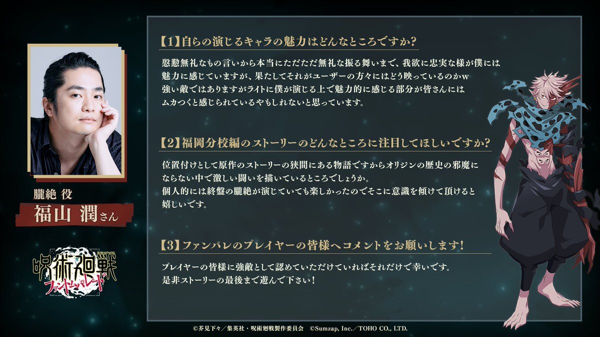 福岡分校編オリジナルキャラクター #朧絶#福山潤 さんよりコメントを頂きました✨ 福岡分校編最終章となる第16章については、 『#ファンパレ1stアニバーサリー公式放送』での情報解禁をお楽しみに! ▼配信URLはこちら youtube.com/live/y2kRANttO… #ファンパレ #呪術廻戦 pic.x.com/rAzC9qYjEl