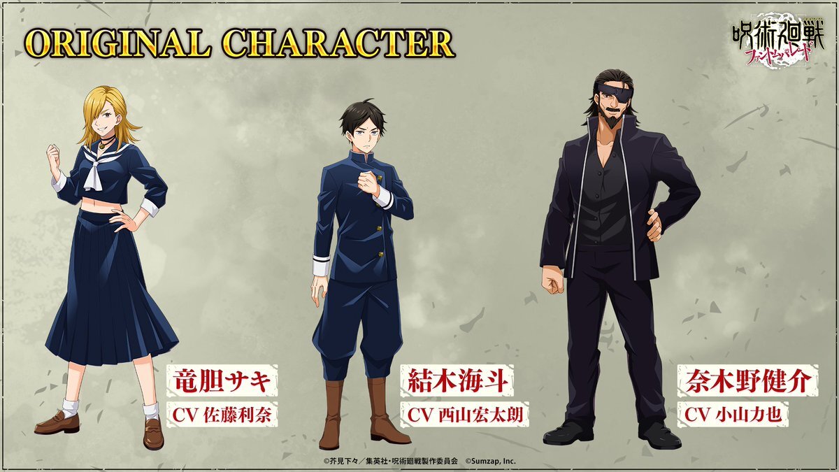 ◤『#呪術廻戦ファンパレ公式放送』速報⑧◢ #ファンパレ「ゲームオリジナルキャラクター」初公開! ▼東京都立呪術高等専門学校・福岡分校一年 ✔️竜胆サキ(CV:#佐藤利奈) ✔️結木海斗(CV:#西山宏太朗) ▼東京都立呪術高等専門学校・福岡分校の学長 ✔️奈木野健介(CV:#小山力也#呪術廻戦 pic.x.com/kzJ5njFkl1