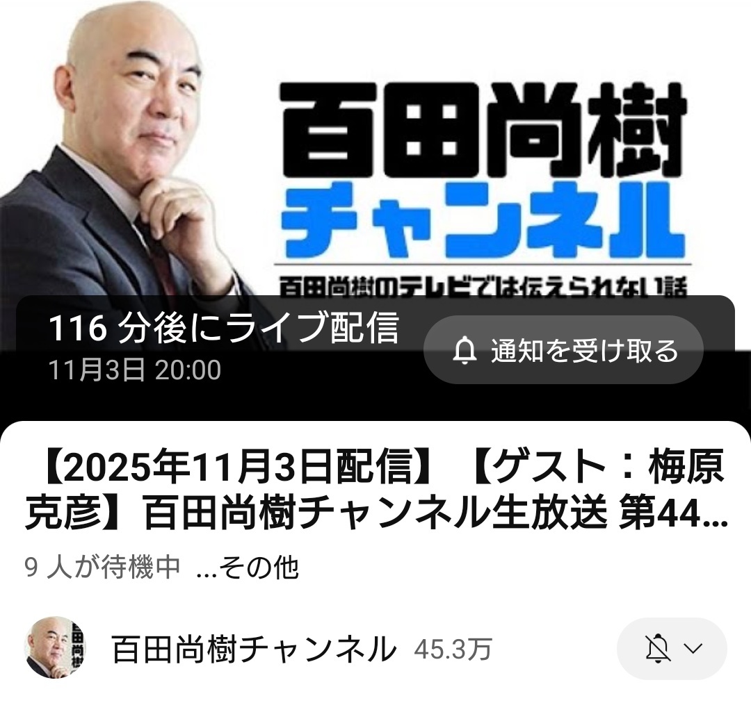 こちらはYouTube(無料タイム) 百田尚樹チャンネル生放送❗️ ゲストは日本保守党 組織運動本部長 兼東北地区統括 梅原克彦さんです。 元仙台市長の梅原さん。 今夜も楽しみです❗️🥰👏 月額880円の有料タイムは ⬇️ニコ生へ‼️🙇✨ @Hoshuto_hyakuta @umeharakatsu #日本保守党 youtube.com/live/goZ1mFdi1… pic.x.com/cb5IUqFIUg x.com/Hoshuto_hyakut…
