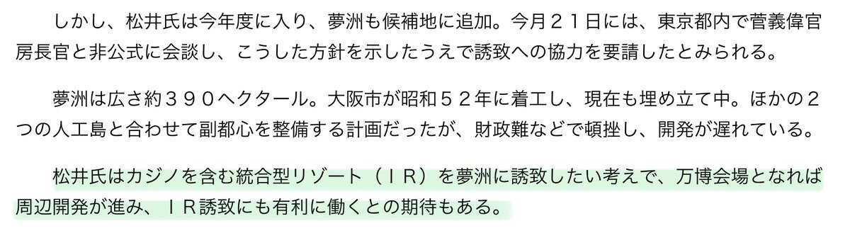 >松井氏はカジノを含む総合型リゾート(IR)を夢洲に誘致したい考えで、万博会場となれば周辺開発が進み、IR誘致にも有利に働くとの期待もある。 カジノが、先です。 x.com/oosakahaoosaka…