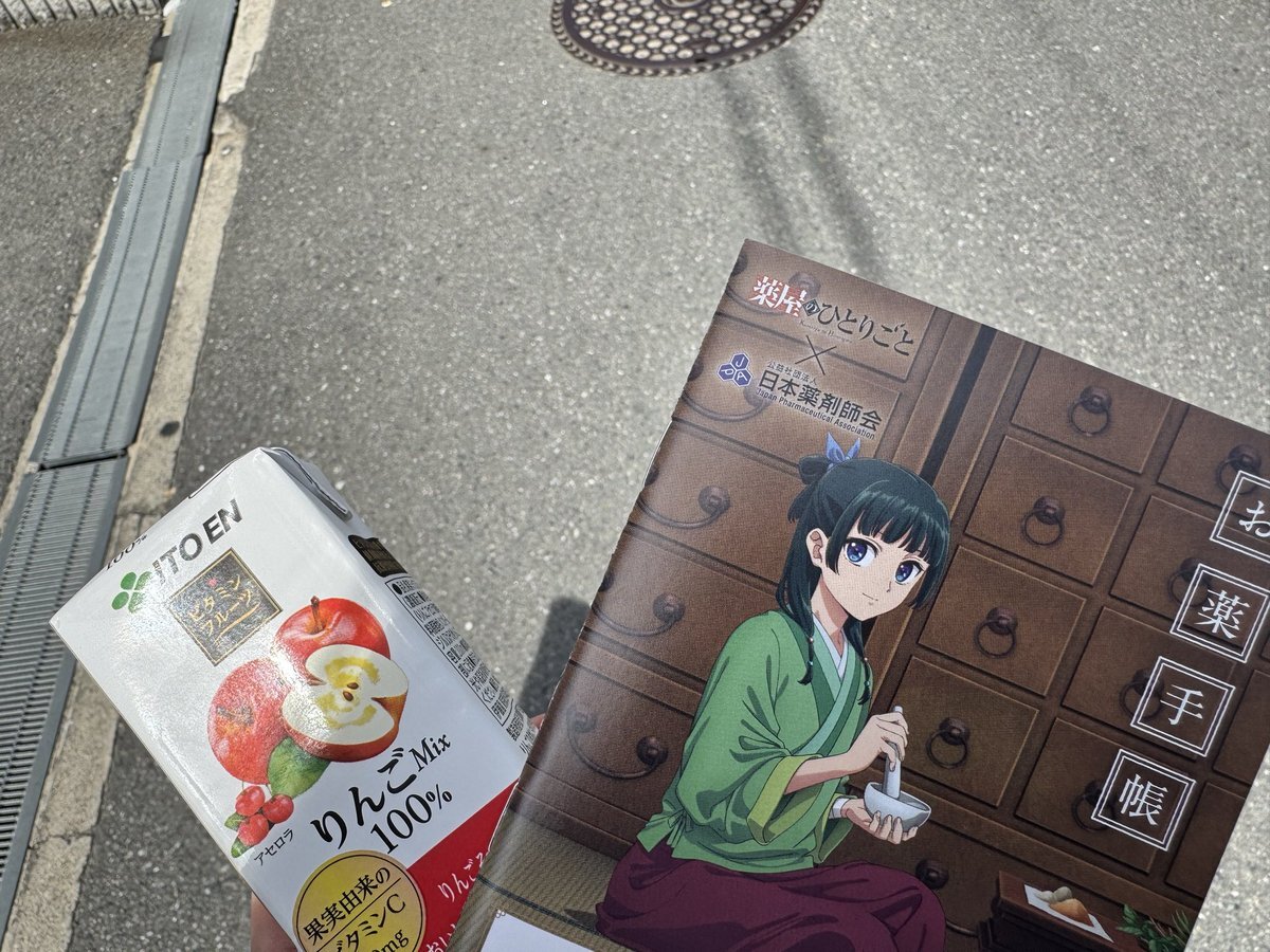お薬手帳もう無かったから作ってもらったら薬屋のひとりごとだった! しかもここの薬局自販機の飲み物1個サービスしてくれるらしい 神か? 引っ越してから色んなところが痒くてやっと皮膚科いけた🥲 pic.x.com/nksbJVsACa