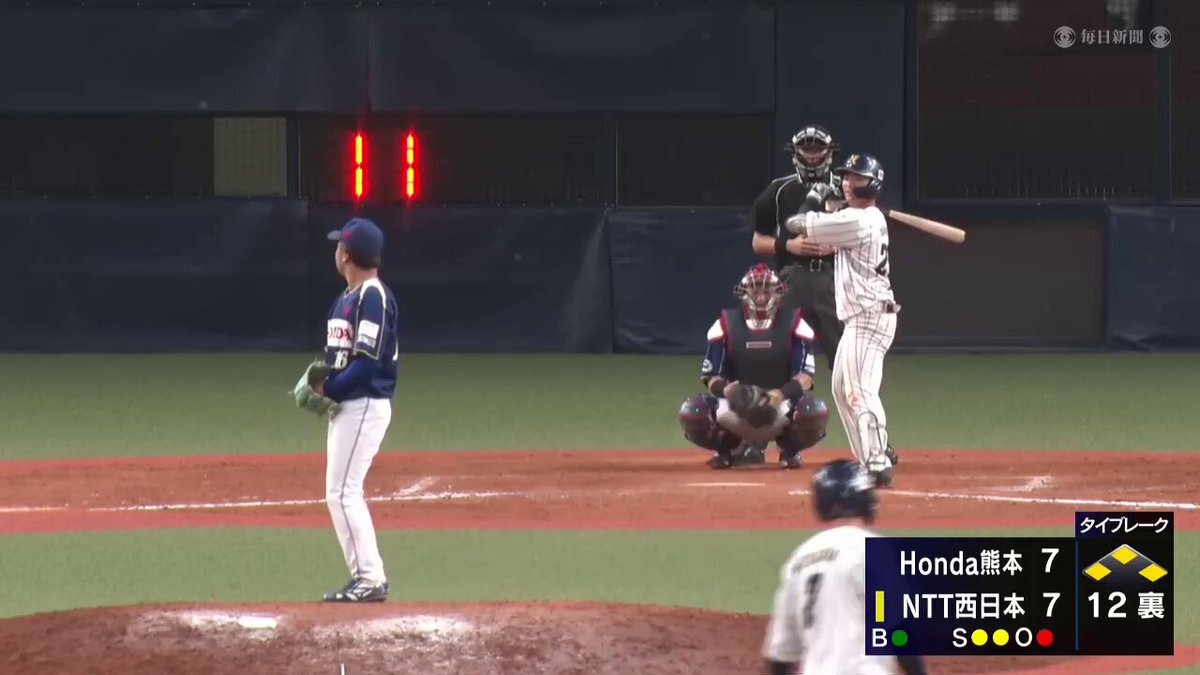 ◢◤#社会人野球日本選手権 準々決勝◢◤ / Honda熊本のセンター・稲垣翔太がチームを救う奇跡のバックホーム⚾ 両チーム譲らず大接戦🔥 \ #NTT西日本 vs #Honda熊本 全31試合を無料ライブ配信🎥 👉mainichi.jp/ama-baseball/s… #社会人野球