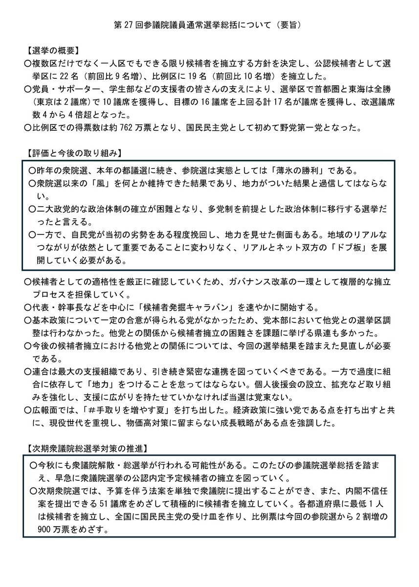 次期衆院選に向けた候補者擁立については、各地域における他党や支援団体とのこれまでの関係や経緯は尊重するものの、どの選挙区に何人擁立するかについては、参院選後にまとめた総括で示した方針に従って、最終的には党本部において決定します。