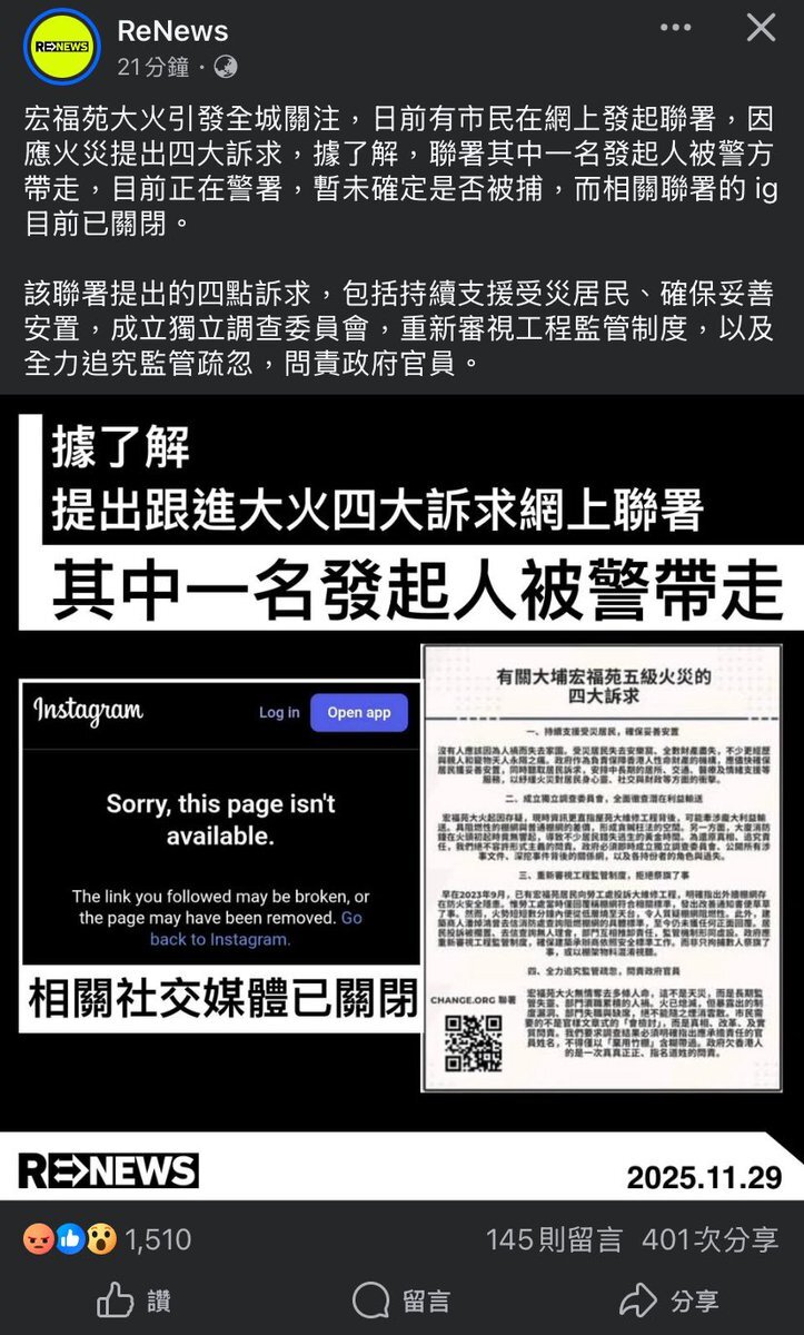 #香港大火 香港市民は「4つの要求」(四大訴求)を提起し、そのうちの1人が警察署に「召喚」された。彼が逮捕されたかどうかは現時点では不明である。 彼のSNSは閉鎖された。 要求内容は「被災住民への支援継続」「移住の確保」「独立調査委員会の設置」「建築事業監視体制の見直し」の4点。 pic.x.com/bP9UyYnaAw