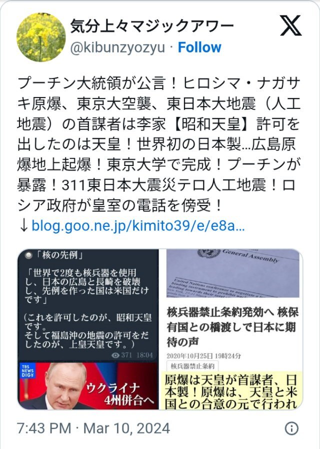 長崎平和祈念式典(8月9日)にロシアやイスラエル、パレスチナも参列🇯🇵プーチン大統領が公言📢ヒロシマ・ナガサキ原爆💥東京大空襲の首謀者は昭和天皇🇯🇵東日本大地震(人工地震)の首謀者は李家【偽天皇家】許可を出したのは偽天皇⚡天皇家の正体は明治維新】で入れ変わった💥⬇kimito39gmailcom.blog.fc2.com/blog-entry-366… pic.x.com/cUUcdaa5LK