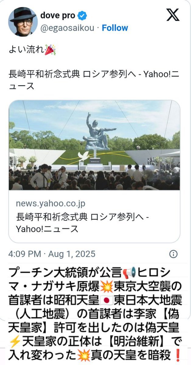 長崎平和祈念式典(8月9日)にロシアやイスラエル、パレスチナも参列🇯🇵過去最多101国・地域の見通し⚡プーチン大統領が公言📢ヒロシマ・ナガサキ原爆💥東京大空襲の首謀者は昭和天皇🇯🇵東日本大地震(人工地震)の首謀者は李家【偽天皇家】許可を出したのは偽天皇⚡天皇家の正体はkimito39gmailcom.blog.fc2.com/blog-entry-366… pic.x.com/1o2RlUriRm