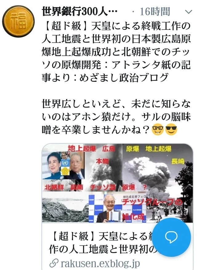 返信先:@0_fighter_taka1995年👆のBlogの執筆者である西岡昌紀氏の投稿が問題とされ「S💩C」の圧力により廃刊まで追い込まれたマルコポーロ廃刊事件… 先日💩米日大使♨️芋ニエル💩が長崎平和祈念式典ボイコットを「G7」へ画策… 長崎市長に抗議文を送った「S💩C」🖕 hexagon.inri.client.jp/floorA4F_ha/a4… blog.livedoor.jp/nishiokamasano… pic.x.com/LYPXUufpcy