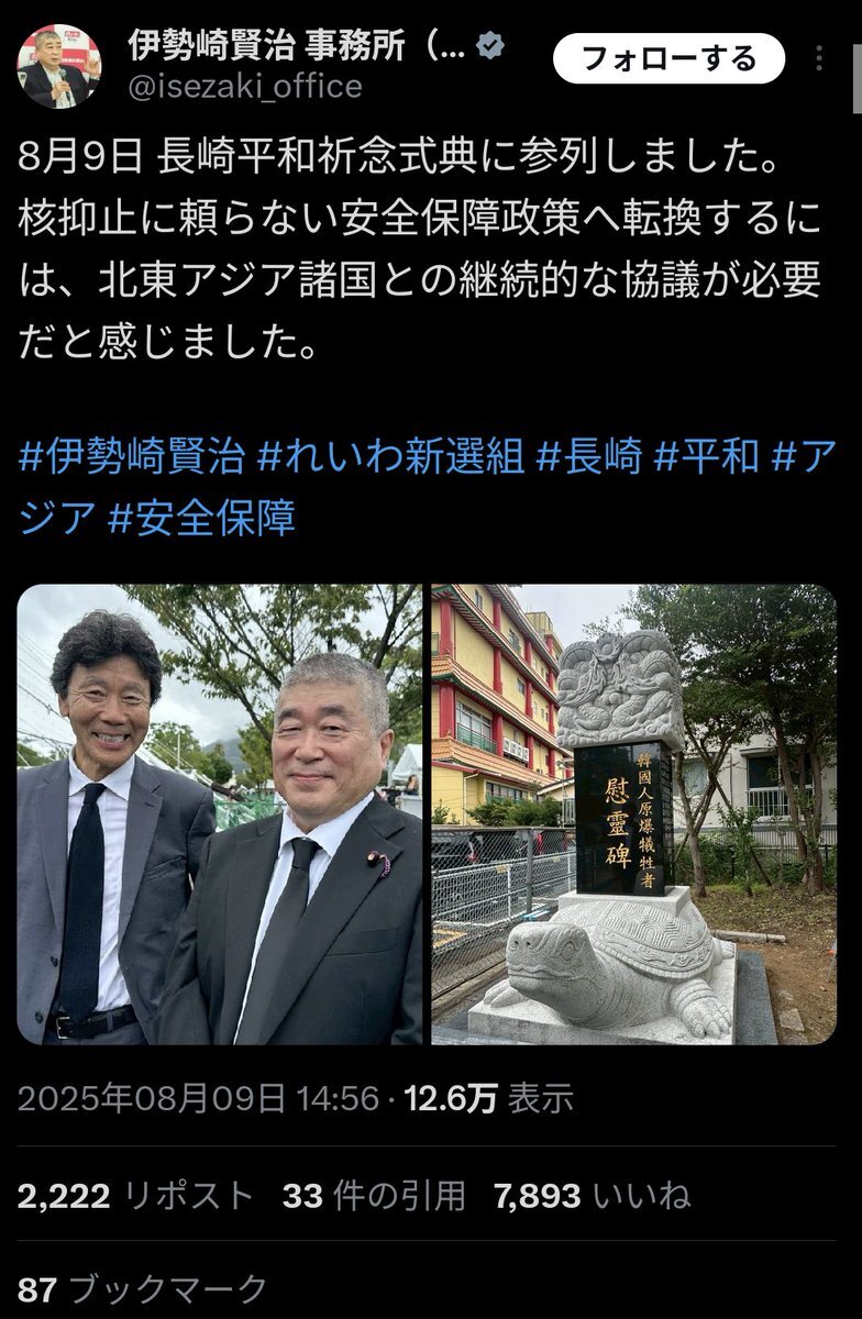 返信先:@max358japanれいわの党員ですが、長崎平和祈念式典に参列したとポストしておきながら何故か韓国人原爆犠牲者の慰霊碑の写真を投稿していました。長崎まで行ったのは日本人のためではなく韓国人の慰霊のため?この党も本当に信用出来ないと思いました。 x.com/fr3tk_neu/stat…