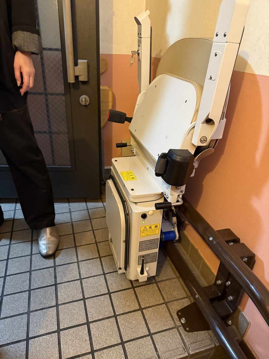 返信先:@misojiyuuマジレスすると、いす式の階段昇降機、つまりバリアフリー対応用の椅子ですね。 エレベーターがない建物に設置していることが多いです。 車いす利用者や高齢者がおもに利用します。