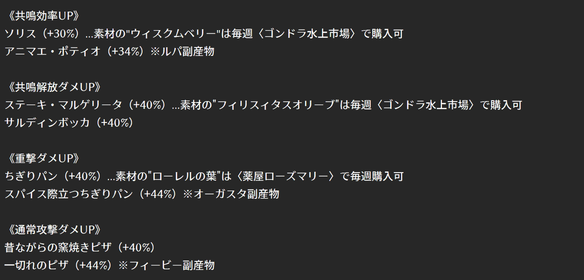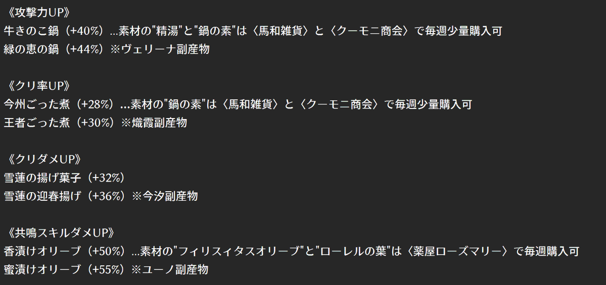 備忘録も兼ねた鳴潮の現状の最強料理一覧。 あと小麦粉、砂糖、食用油、塩、唐辛子など、"素材の素材"になるものは毎週買って損はないかも。ただしシェルコインの出費はかなりある。 pic.x.com/bpZ4MCe1Vm
