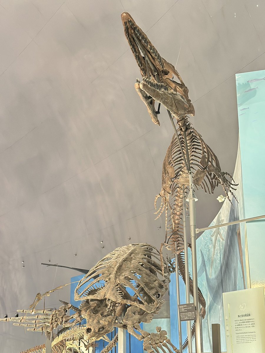 魚竜類や首長竜類が泳ぎ回っていた中生代の海🌊 モササウルス類の中でも最大級のティロサウルス・プロリゲルは、鋭く並んだ歯が特徴的で、この全身骨格標本からは、喉の辺りにも歯が生えていることが分かります✨ 全長13m、頭骨は高い場所にありますが、ぜひ見上げてみてください👀 pic.x.com/WRl0YlFlIi