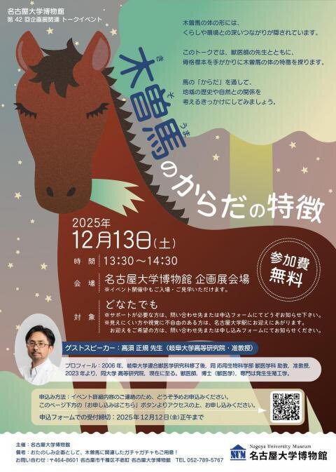 12月13日(土)は、トークイベント「木曽馬のからだの特徴」を開催します! 獣医師の高須先生と第三春山号の骨格標本を囲んで、対話式に、興味関心を広げ深めていきましょう! どなたでもご参加頂けます🐴 num.nagoya-u.ac.jp/events/satelli… pic.x.com/YcHA35wep6