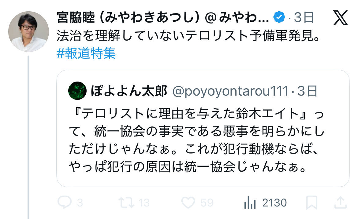 事の発端は私のことを『テロリスト予備軍』と誹謗中傷する輩が現れたことでした。私は統一協会のように霊感商法をしたこともなく高額献金や先祖解怨や中心霊分立で組織的に金を奪ったこともない善良な一般市民です。それがテロリストなどと酷い誹謗中傷を受けて、非常に頭に来た訳です。そこで私は ↓ pic.x.com/oRpi8qCktJ