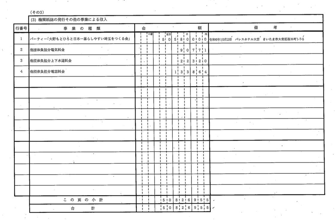 大野知事の資金管理団体「彩裕会」R6の収支報告書が出ました!! これまでは「パーティ一発4000万円の男」でしたが、なんとR6は更に1千万円増え「パーティ一発5000万の男」になってました。 pref.saitama.lg.jp/documents/2745…