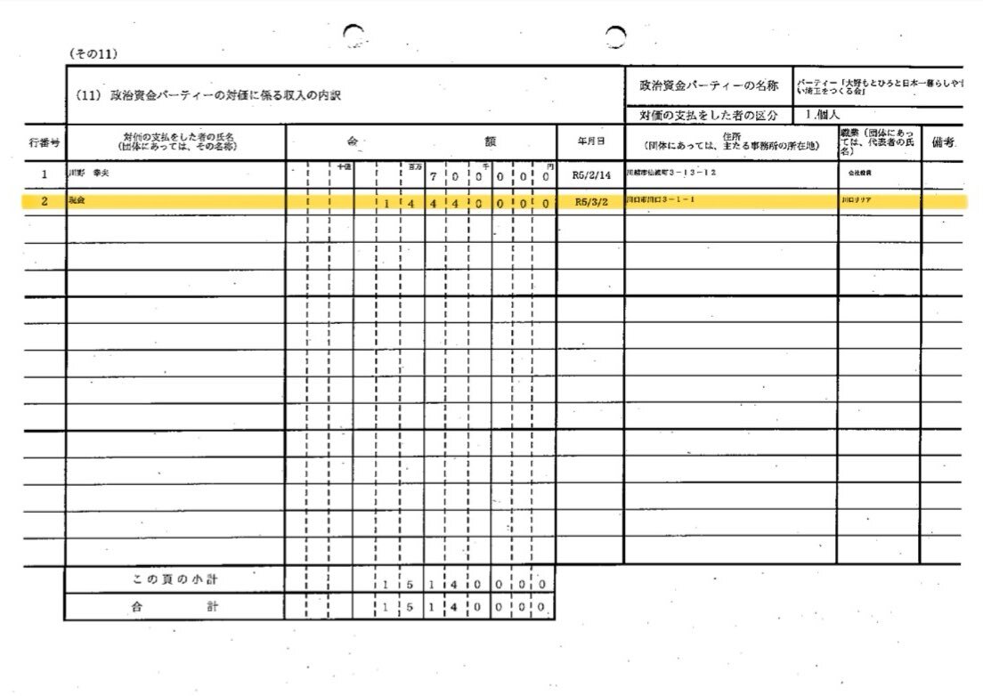 何これ。 大野知事の「彩裕会」R5終始報告書。 ⬛︎寄付者の氏名・団体名称→【現金】 ⬛︎職業・代表者氏名→【川口リリア】 ⬛︎パーティ対価収入→【1440万円】 現 金(ゲン キン)さんから1440万円献金されたんですか? pref.saitama.lg.jp/documents/2607…