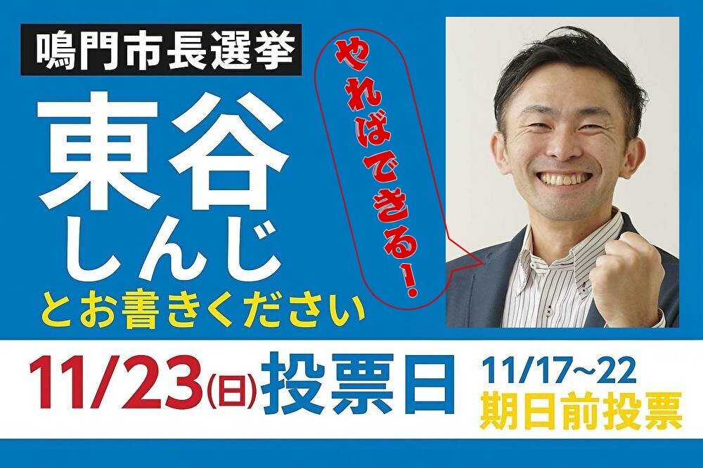 昨日、11/16より鳴門市長選挙が告示されました! 新人候補の 東谷しんじ(伸治)さん は、私が心から尊敬し信頼している友人です。 東谷さんと出会ったのは3年前、「四国若手議員の会」の研修会でした。 歳は離れていますが、同じ若手議員として関わる中で、