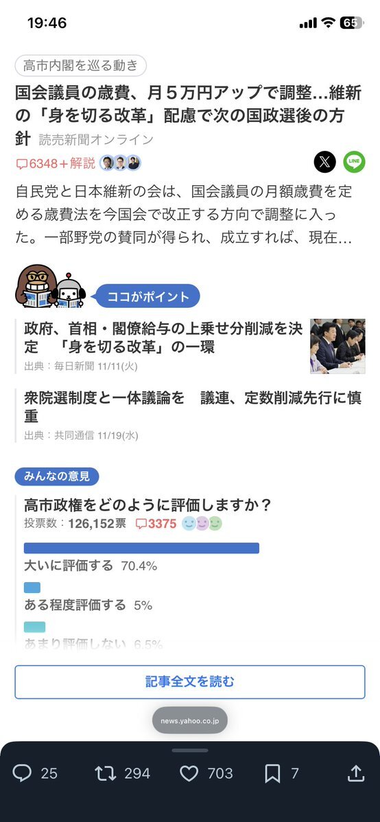 返信先:@takaichi_sanae議員の歳費上げるとか何考えてんだ。 議員削減も曖昧なのに、てか1人5万円も歳費上げたら1ヶ月に3500万円の経費上がるんだぞ。これで議員削減したらかとて元の木阿弥じゃ。