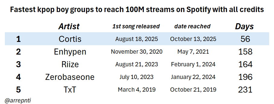 CORTIS BECOMES THE FASTEST KPOP BOY GROUP IN HISTORY TO REACH 100M STREAMS ON SPOTIFY!!