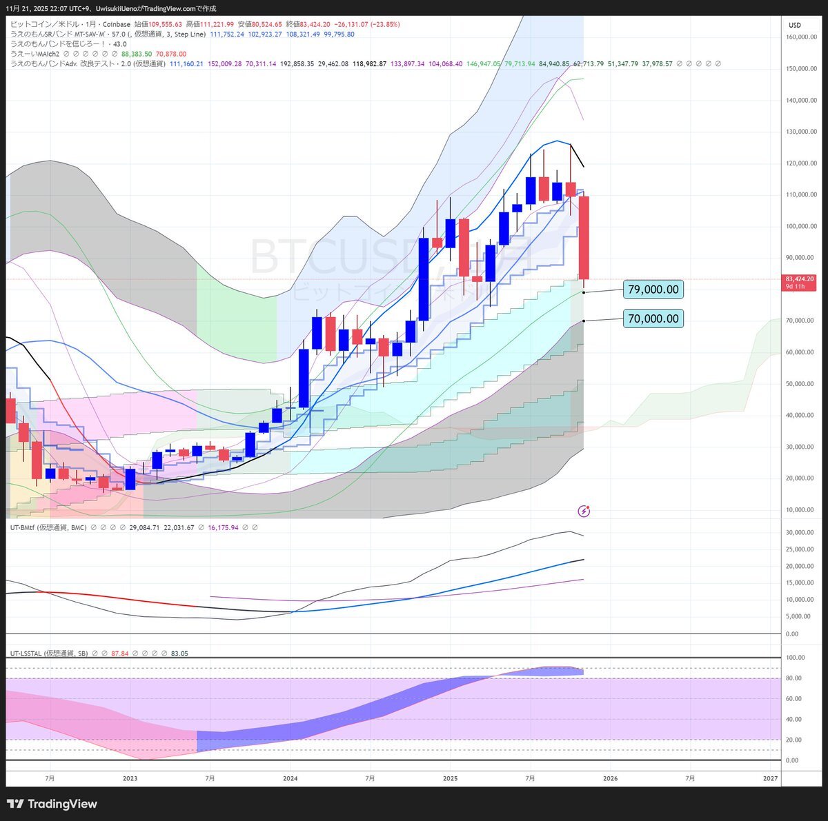BTC uubnsk ビットコイン、ここまで来ると下は月足の各要素が重要になってきて、足元79000㌦くらいに下落を弾きやすい重要なライン その下70000㌦に下バンド とりあえず今月来月くらいはその辺が重要だと思っておくといいのだ うえのもんバンドを信じろー!٩(ˊᗜˋ*)و