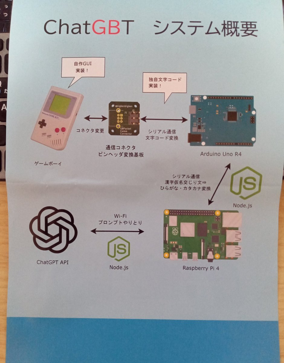 ゲームボーイでChatGPTと会話するシステムがすごかった! ちゃんとGBの通信ケーブルのプロトコルでArduinoと通信して、GB側の独自文字コード(ひらがなカタカナ英字)とUTF8を変換してプロンプトを作り、返ってきた文字列もまた逆変換してGB側に返してる。 GBの画面もHDMI信号に変換出力!(*´ω`*) pic.x.com/yObwR5NE2m x.com/bigbenbigben/s…