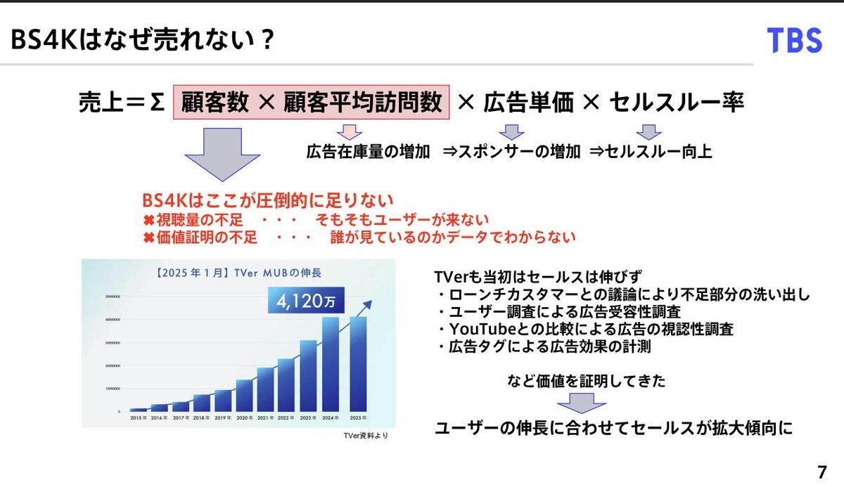 民放のBS4K放送撤退報道は、おそらく「衛星放送WG」の話なんですが、TBSの資料が泣けるので興味がある人は見よう BS4Kはここが圧倒的に足りない *視聴量の不足 ・・・ そもそもユーザーが来ない ★価値証明の不足 ・・・ 誰が見ているのかデータでわからない soumu.go.jp/main_content/0… pic.x.com/1NQUL6FKfN