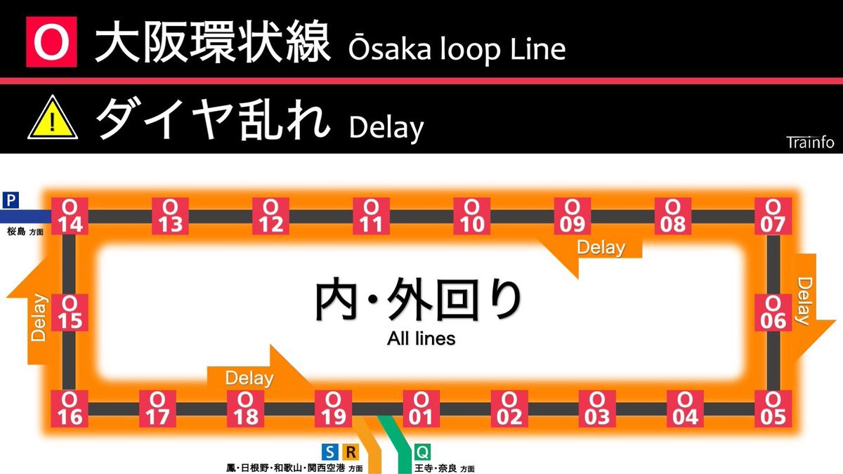 【大阪環状線 内・外回り 遅延情報】 大阪環状線は、5:39頃、JR宝塚線内での踏切内自動車立往生に伴う緊急停止信号受信→エアセクション安全確認の影響で、一部の内・外回り電車に5分以上の遅れがでています。 pic.x.com/OHLzyMfDkZ