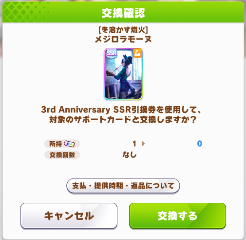 ほぼ化石と化した3rdアニバSSR引換券を使う時が来た! 12月1月チャンミで有効の右冬がこれ1枚で取れる! 訳:配布スぺじゃ冬ウマ娘〇全然因子化しないから心折れた pic.x.com/gWeLsPRBYX