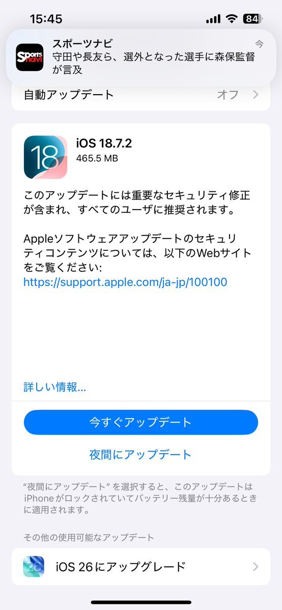 ios18.7.2をアップデートしようとしても後で通知が表示されて一向にアプデされない事十数日 諦めてios26.2でアプデする事にした ios26はスムーズに進行中 もう26に強制変更しろということかな