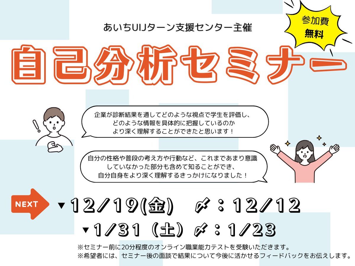 【出展告知】 🍃地方・地元大相談会 in 大阪体育大学🍃 12月5日(金)大阪体育大学で開催する相談会に出展します! 場所:N号館 N202 時間:11:40~13:30 地元就職に興味がある方、悩んでいる方も大歓迎です! UIJターンの進め方や、愛知県の企業で働く魅力を分かりやすく紹介します📚
