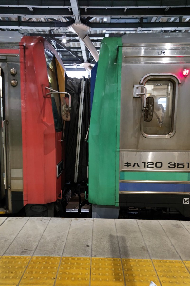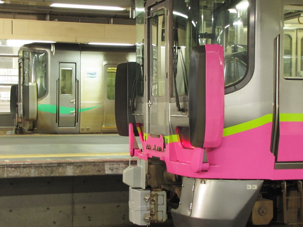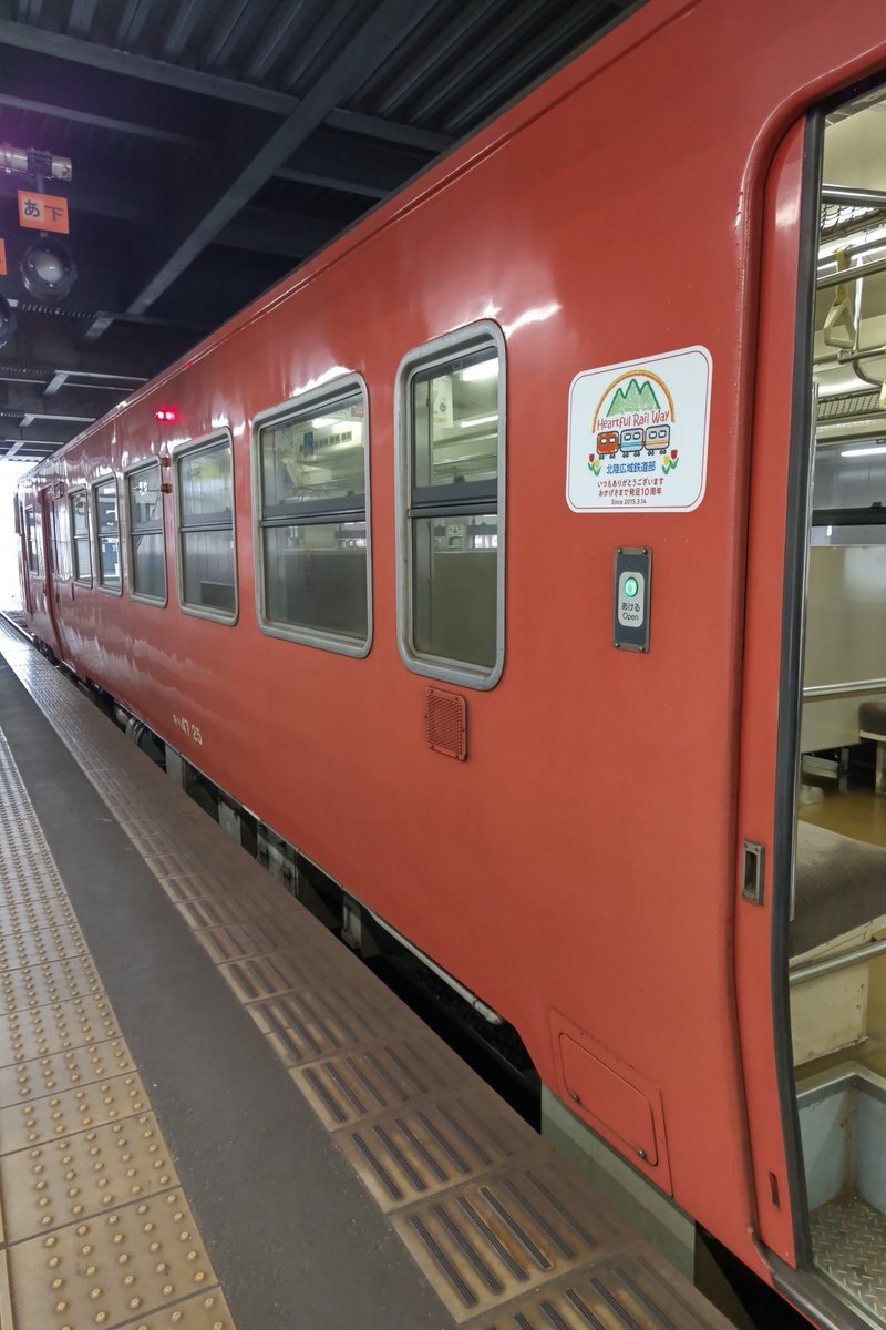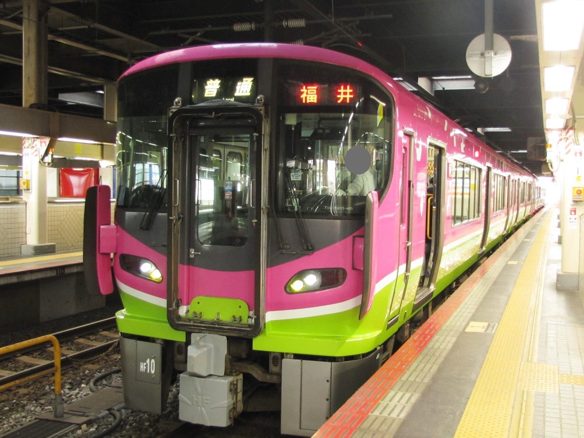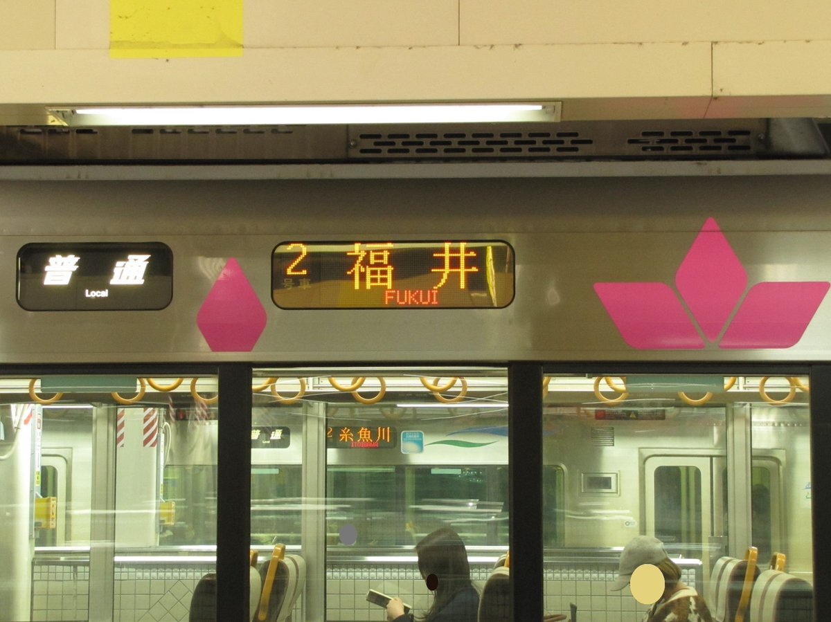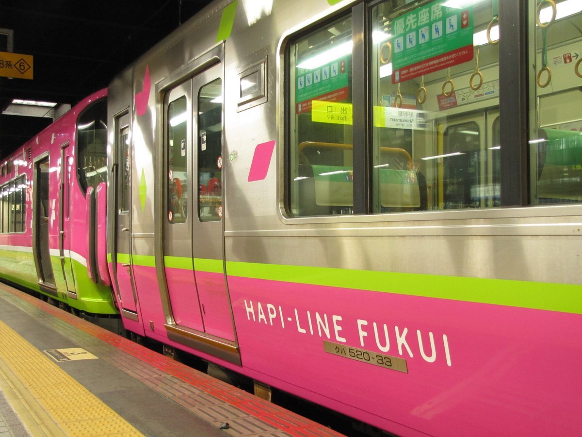 ハピラインふくいの521系、フルラッピングの特別色と一般色が連結されるとどうしても特別色に目がいってしまいますが、画像のHF04編成は一般色の中でも唯一転落防止幌が特別色と同じピンクにメイクアップされたちょっとオシャレな子😊💄✨ スカートにはJR西日本時代の編成番号もバッチリ残ってます😁✌️