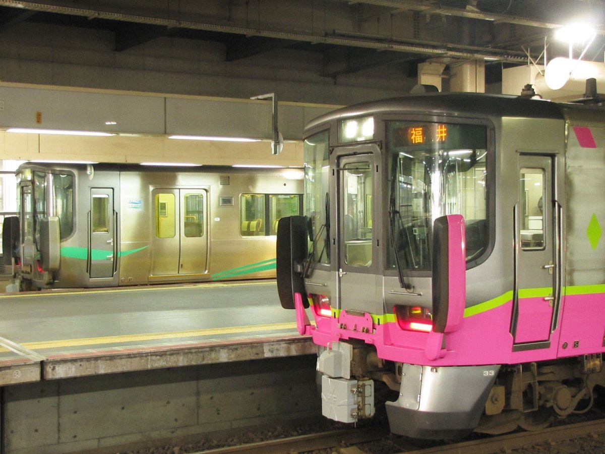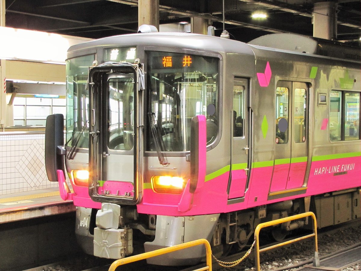 転落防止幌がちょっとオシャレなハピラインふくいHF04編成は今日もフルラッピングHF10編成と手をつないで金沢へ🥰💄 あいの風とやま鉄道521系とのコラボも見られました😁✌️ #521系 #ハピラインふくい #あいの風とやま鉄道 pic.x.com/YY63hwtXCS x.com/eyes521rs/stat…