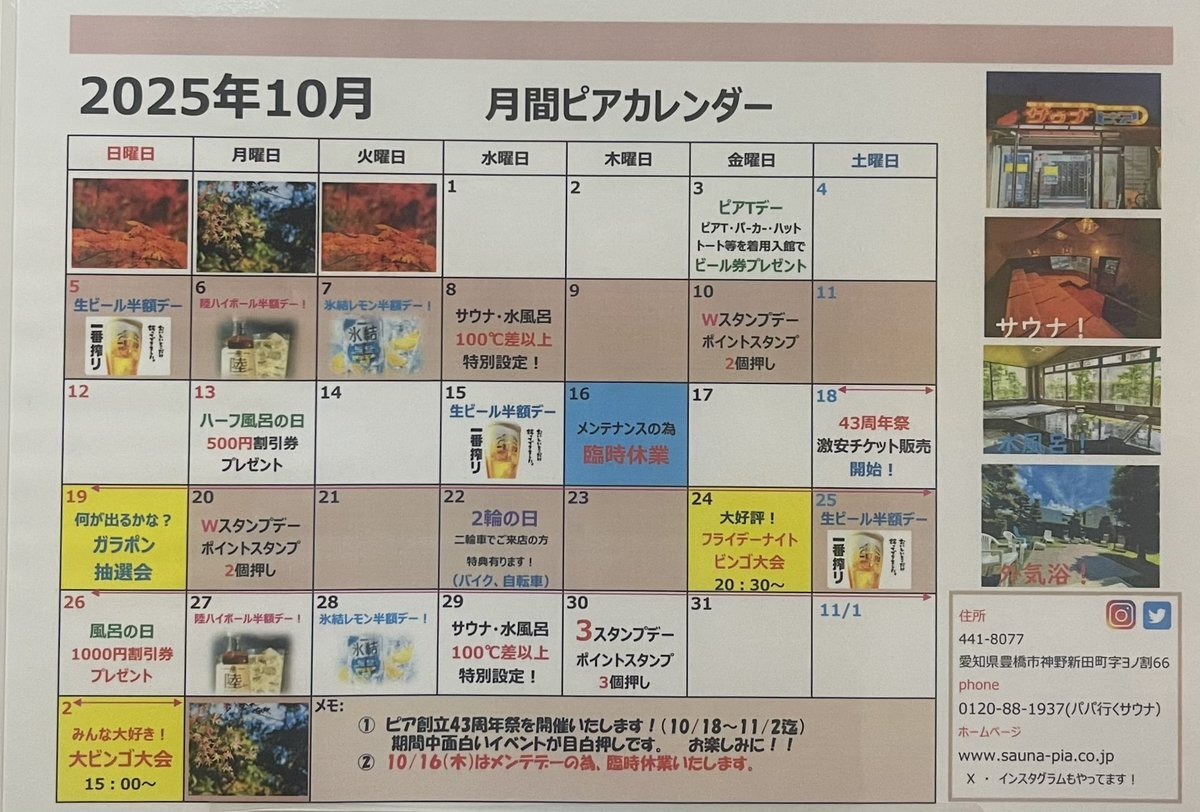 おはようございます😊 10月のピアカレンダーです📆 今月は、18日から「43周年祭」を実施いたします‼️ 今回初めてどて煮のテイクアウト販売をいたします。前回ご好評いただいたフライデーナイトビンゴ大会などなど。 お客様のご来店を心よりお待ちしております♨️