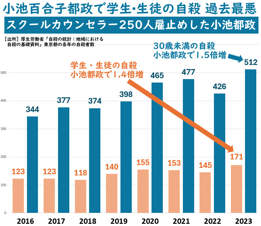 非正規都職員の正規化は都民のいのちにかかわります。小池百合子都政は今年3月末にスクールカウンセラー250人を雇い止めしました。そうした小池都政のもと学生・生徒の自殺は1.4倍増で過去最悪。30歳未満の自殺も1.5倍増と「生きづらさ」が広がる東京を #蓮舫 さんと #あなたと次の東京へ 変えましょう pic.x.com/iHm0dWWU7U
