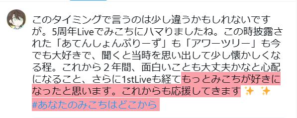 見始めた時期としては私服3Dのお披露目くらいの時だったけど、その頃はまだホロライブ全体を浅く広く見てた気がする。 その後、4周年ライブでみこちが歌った「らしさ」がめちゃくちゃ自分に刺さって、感動したから35Pとして応援したくなったんだっけかな。 #あなたのみこちはどこから