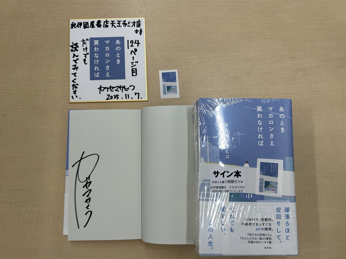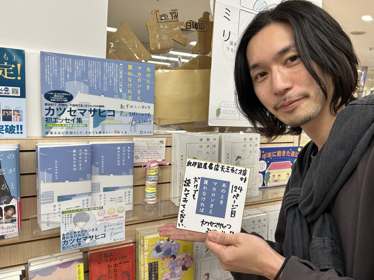 【著者ご来店】 #カツセマサヒコ さんがご来店! マカロンでお出迎えしました😊🍬 初エッセイ 『#あのときマカロンさえ買わなければ』に サインをいただきました! サイン本にはステッカーついてます。 サイン本コーナーとCイベント台にも 展開中です! pic.x.com/uj3afAEDtD