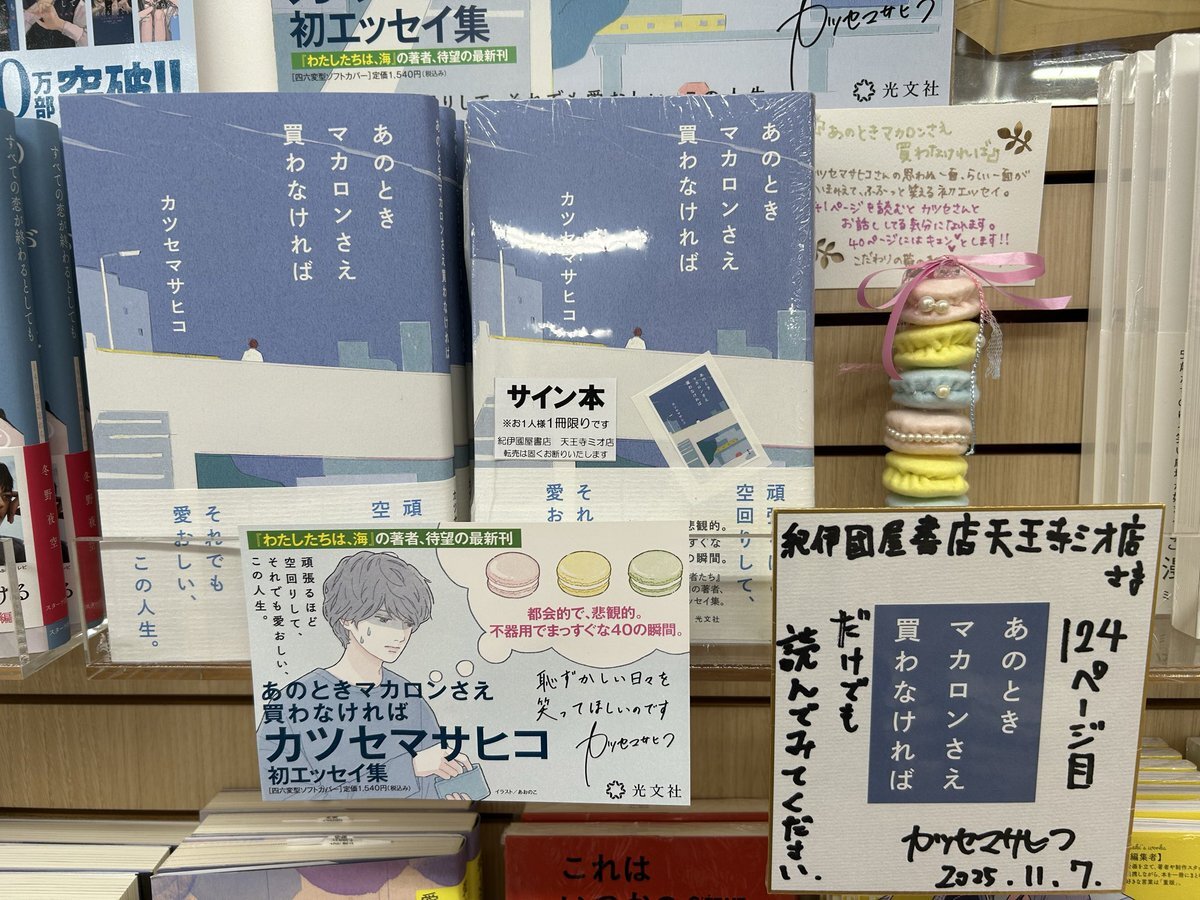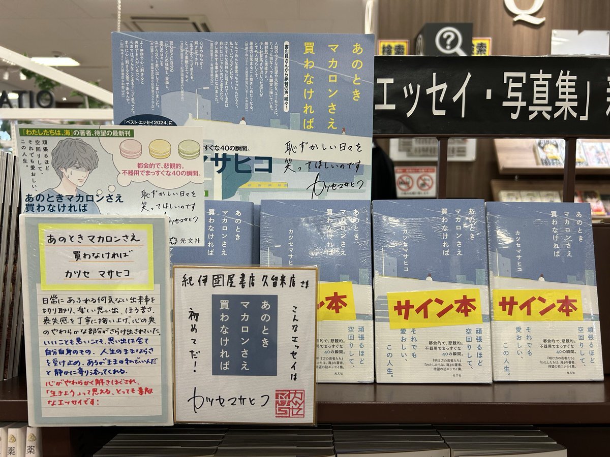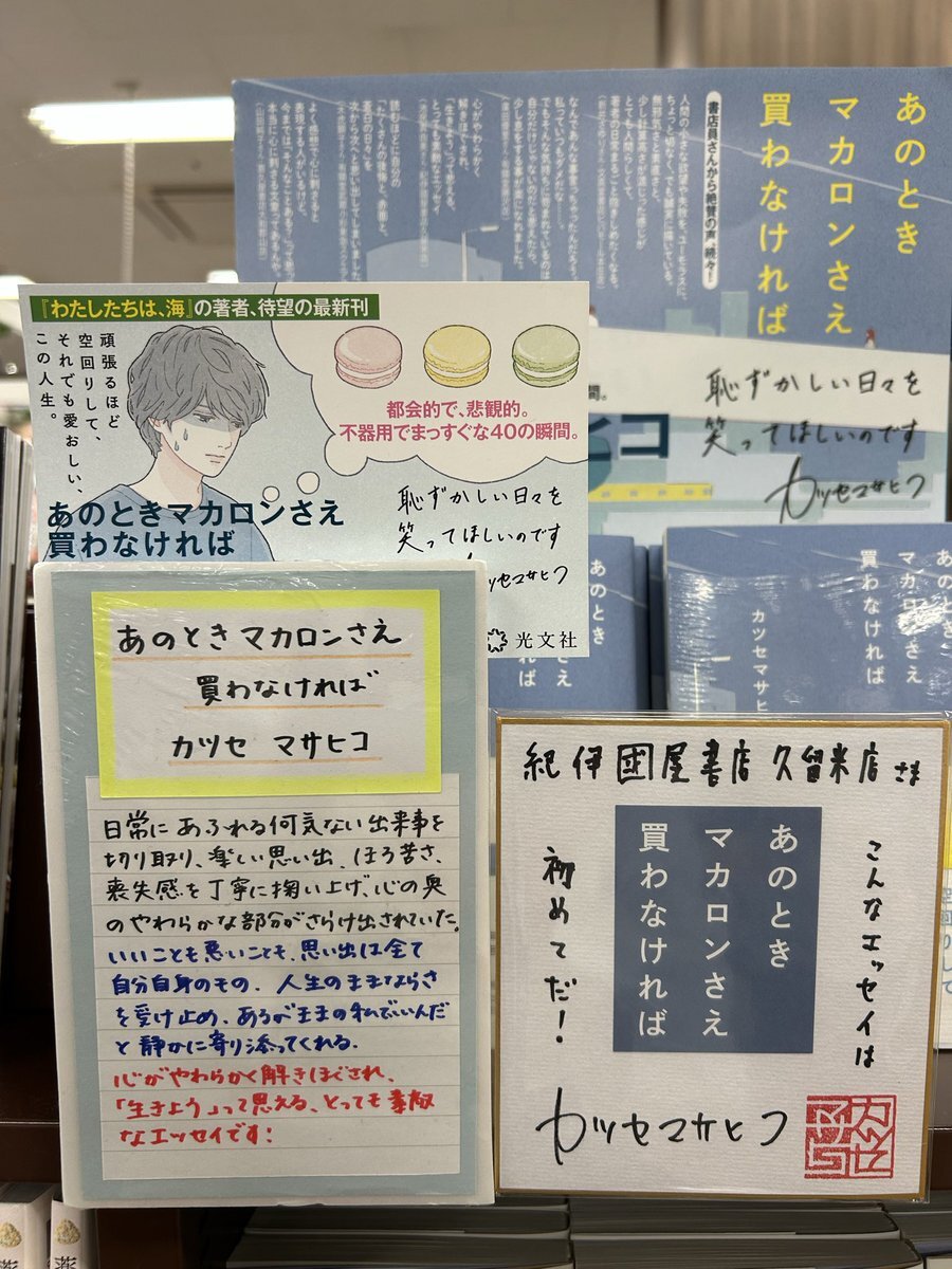 【文学】 先程、#カツセマサヒコ(@katsuse_m)さんがご来店🎊 最新刊『#あのときマカロンさえ買わなければ』(#光文社)のサイン本を作成いただきました🖋️ ご自身初のエッセイ集は、とても愛おしく尊い1冊になっています💐 72ページには当店のお隣にあるあのカフェが登場しますよ😉☕️ pic.x.com/52EU1gwVL2