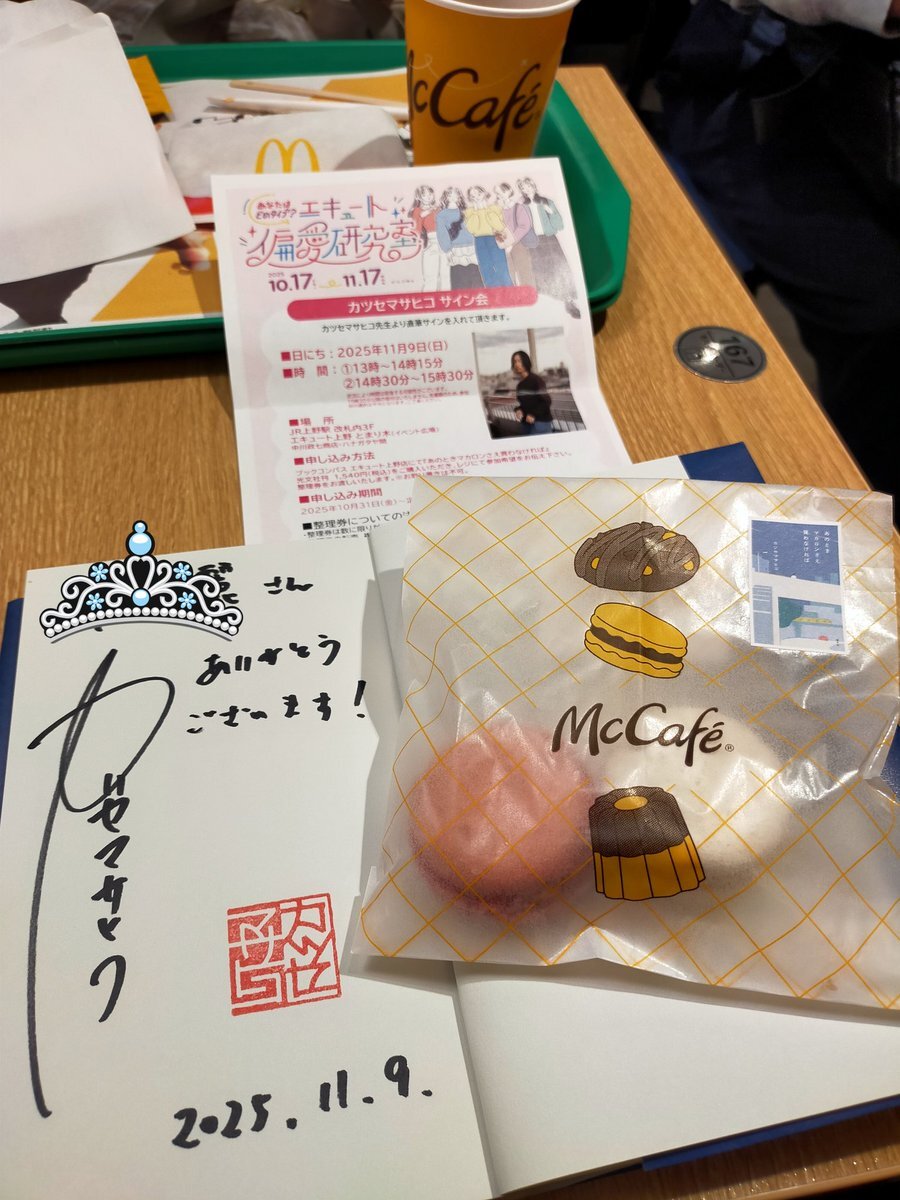 昨日の📚サイン会 皆さん沢山話せて凄い 順番来るまで緊張高まる… 眼鏡姿カツセさん😳❤️🔥目の前に座って名前だけじゃなくいつの間にかメッセージまで 書いてあった🥹 約150人?それぞれのエピソードを聴き笑い丁寧に対応されてた1時間半待ちも含め幸せな時間だったな #あのときマカロンさえ買わなければ pic.x.com/bFvDlgPYOx