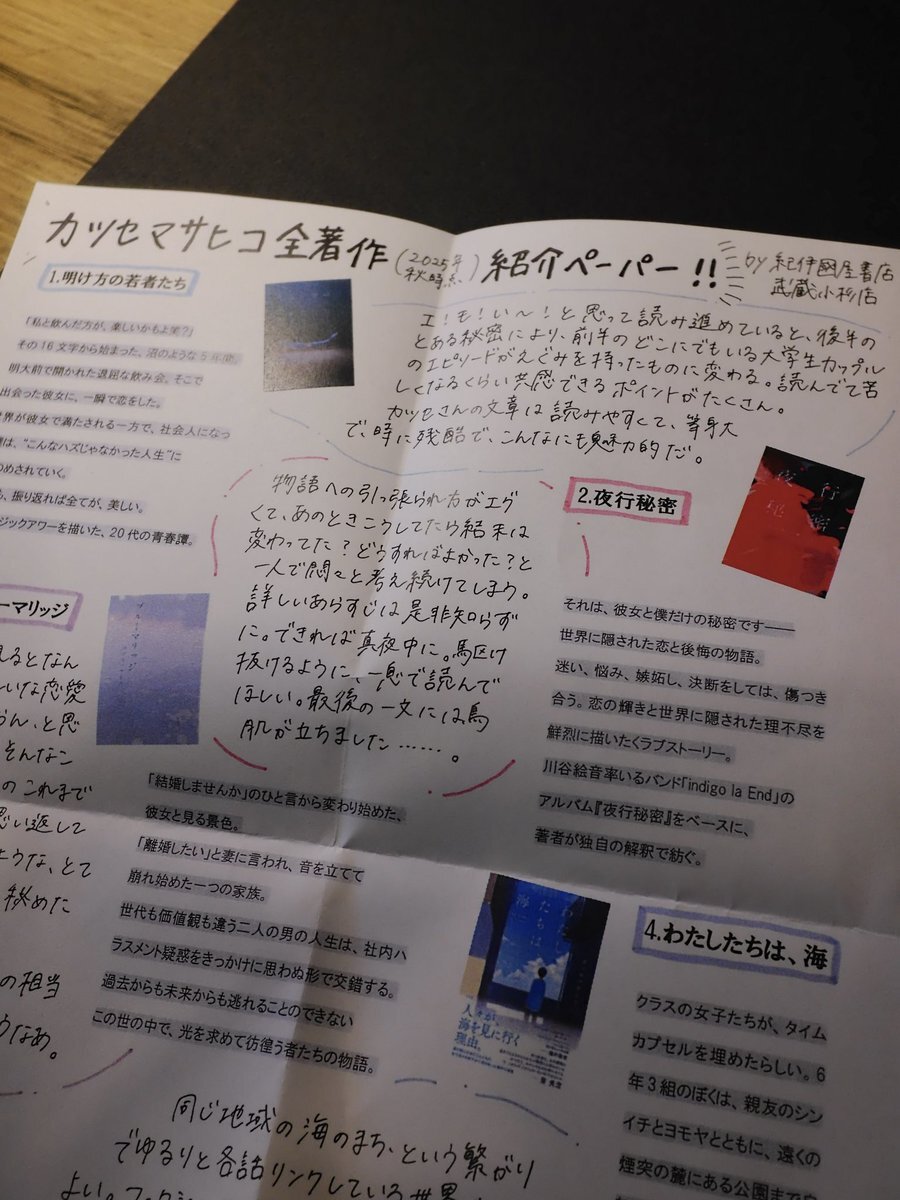 「紀伊国屋書店の武蔵小杉店でサイン会をやろうとしたら当日そのビルで火事が起きてイベント中止になった」という旨をエッセイに書いたら、お店でアンサー記事とカツセの既刊全巻紹介ペーパーを作ってくださりました。ぜひ武蔵小杉店に聖地巡礼してみてください。