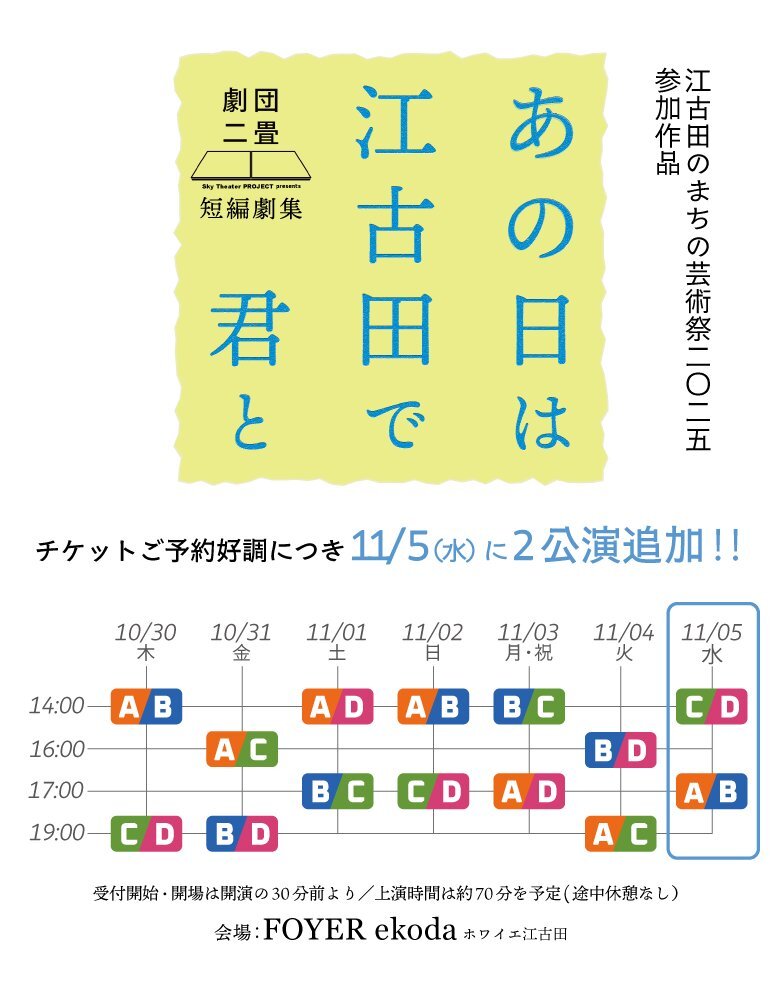 🎫追加公演決定🎫 #劇団二畳 「 #あの日は江古田で君と 」 ご好評につき追加公演が決定㊗️ 追加公演11/5(水)17:00 ABに石松は出演です! 元々のご予約URLからご予約可能です🎫 他の回をご予約済みの方、追加公演回への変更も可能です! この後の公式ポストのリポストをご参照ください📮 x.com/2theater/statu…