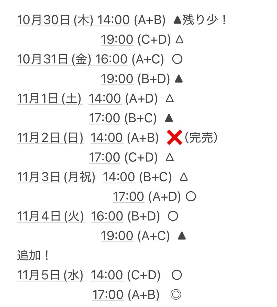 🎫 #あの日は江古田で君と 残席情報🎫 [出演回] 10/30(木)14:00 AB🔺 10/31(金)16:00 AC 11/1(土)14:00 AD 11/2(日)14:00 AB🈵 11/3(月・祝)17:00 AD 11/4(火)19:00 AC🔺 11/5(水)17:00 AB⭕️←オススメ! 🎫ご予約(石松扱い) ticket.corich.jp/apply/400023/0… x.com/2theater/statu…