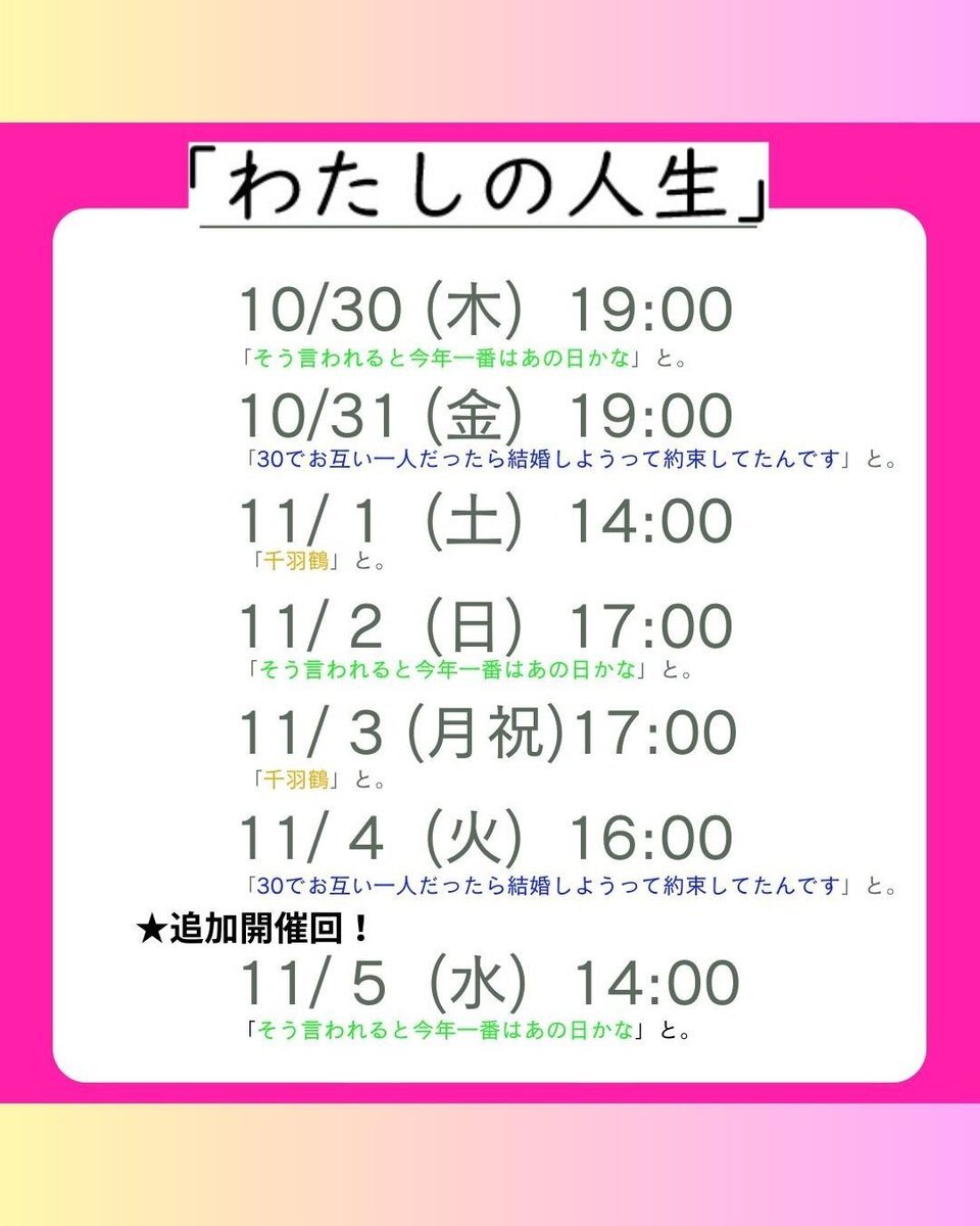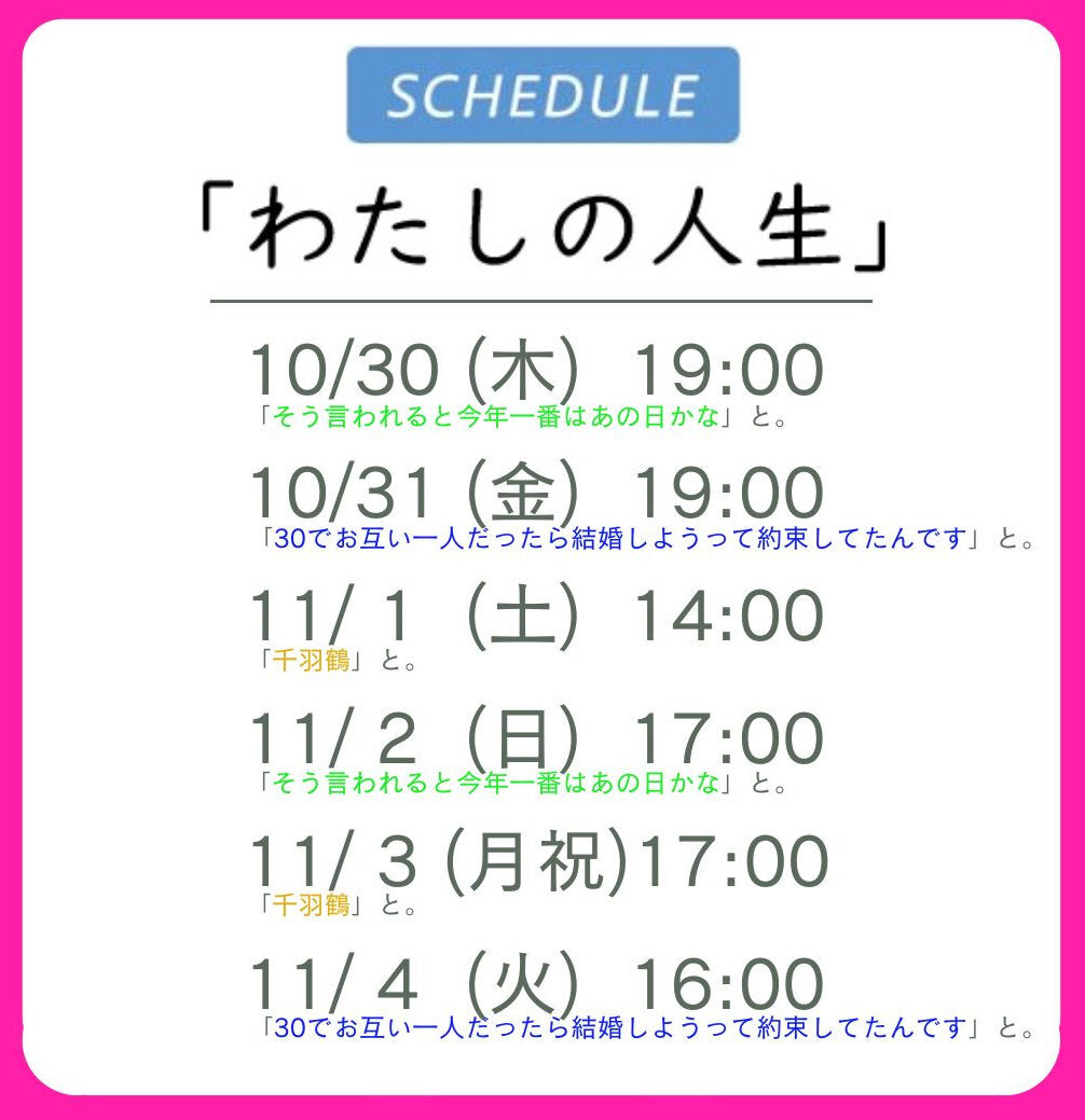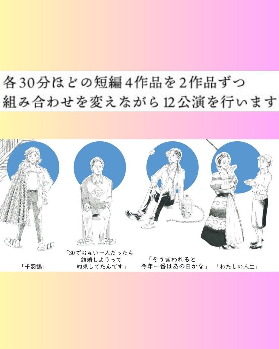 #あの日は江古田で君と A「千羽鶴」 B「30でお互い一人だったら結婚しようって約束してたんです」 合同稽古! Bチーム、ふっと笑えて、家族のやりとりに心が温かくなるお話。 なが〜いタイトル🤭 ⬇️A+Bの回⬇️ 10/30(木)14:00🔺 11/2(日)14:00🈵 11/5(水)17:00 🎫ご予約 ticket.corich.jp/apply/400023/0… pic.x.com/vMHUfd4fe9