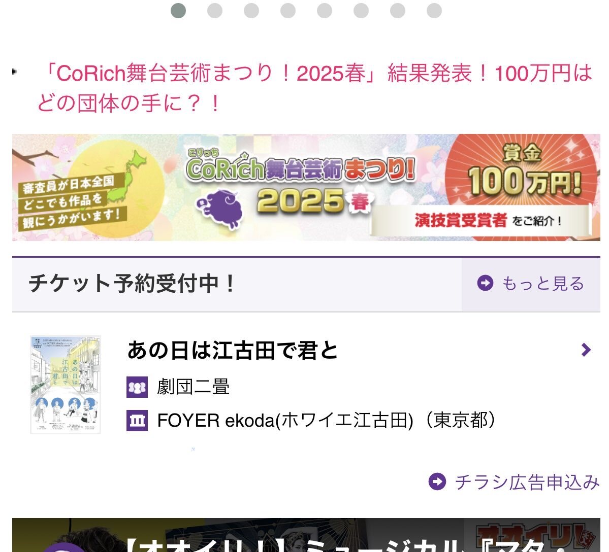 #劇団二畳 #あの日は江古田で君と チケット予約のシステムも利用させていただいてます演劇情報サイト #こりっち舞台芸術 のTOPページで公演情報告知(広告)スタートしました!添付画像はスマホでの表示です。 ご予約 ticket.corich.jp/apply/400023/